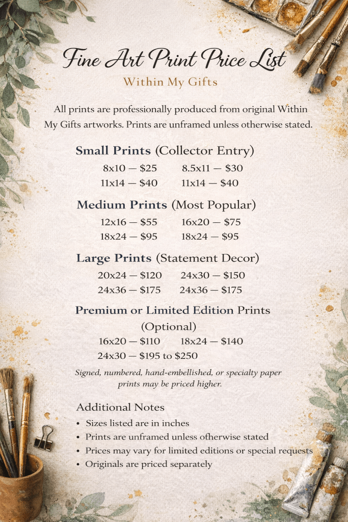 | Deposit & Payment: Contract Agreement All commissioned projects require a signed commission contract before work begins. The contract outlines the scope of work, payment terms, timeline expectations, copyright ownership, and client responsibilities. A deposit and signed contract are both required to secure your commission. Deposit & Payment A non-refundable deposit of 50% of the total commission price is needed to reserve your project and secure your place on my schedule. Work will not begin until the deposit has been received. The remaining balance is due upon finishing the artwork and before delivery or shipment. Artwork will not be released until full payment has been made. Deposits will only be refunded if I am unable to finish the commission within a reasonable timeframe. Booking & Agreement By submitting a deposit, you acknowledge that you have read, understood, and agreed to the terms outlined in this policy. Timeline & Creative Process Each piece is created with care, intention, and emotional depth. Estimated finish timelines will be discussed before booking and can vary depending on size, complexity, and current workload. All finish dates are estimates. Delays occur due to material availability, creative process requirements, or unforeseen circumstances. Clients are responsible for providing timely responses to progress updates. Delayed communication may result in extended timelines. Customization & Price Adjustments Once the size, concept, and details are agreed upon, any additional requests or changes may result in a price increase. All price adjustments will be communicated and approved before additional work begins. Cancellations & Changes All deposits are non-refundable. Once work has begun, commissions cannot be canceled or significantly altered. This policy protects the time, materials, and creative labor invested in your piece. Shipping & Delivery Shipping is not included unless otherwise stated. For clients outside of Fort Wayne, shipping costs will be calculated after finishing and billed separately. All artwork is packaged with care. Tracking information will be provided once sent. Within My Gifts is not responsible for delays, loss, or damage caused by shipping carriers. Local pickup may be arranged when available. Payment Plans Payment plans may be offered on a case-by-case basis and must be approved before booking. Failure to complete scheduled payments may result in forfeiture of the deposit and artwork. Copyright & Usage Within My Gifts retains all copyrights to commissioned artwork. I reserve the right to photograph and share completed work for portfolio, website, exhibition, and promotional purposes. Buying of artwork does not transfer reproduction or commercial rights unless otherwise agreed in writing. Final Note Thank you for trusting Within My Gifts with your vision. Every commission is approached with care, respect, and intention. I look forward to creating something meaningful with you. |